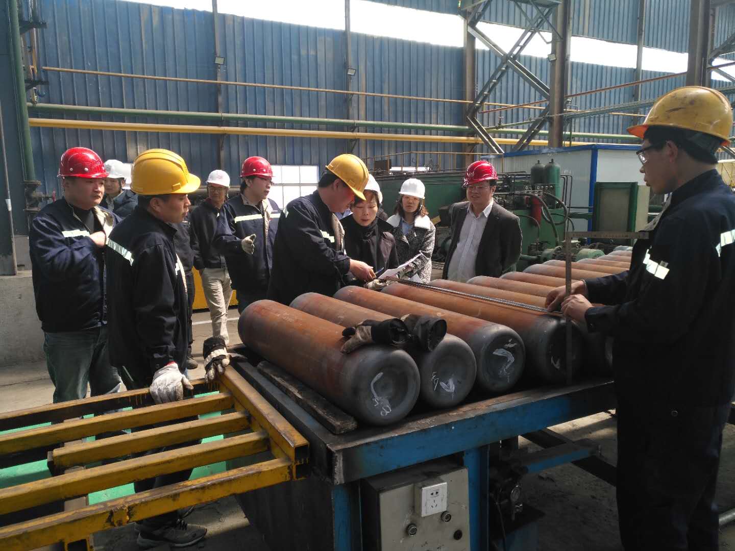 AP公司專家就寬城天海生產的的產品規格、技術參數、工藝指標做了詳細的了解,并就產品的型式實驗、取證和投產等工作的時間線達成初步共識。隨后專家組一行參觀了寬城天海沖拔瓶車間、管制瓶車間和冷加工車間。